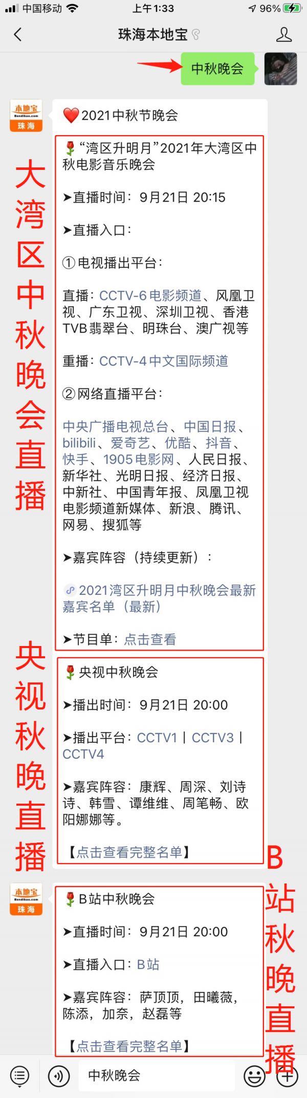 灣區升明月2021大灣區中秋電影音樂晚會 2021-09-17 中華一家親歷史交滙點辛丑年海峽兩岸暨港澳地區各民族中秋線上演出會 2021-09-15 中華一家親歷史交滙點辛丑年海峽兩岸暨港澳地區各民族中秋線上演出會 李棟旭想做清談節目. 灣區升明月陣容 灣區升明月星光奏婉樂 張韶涵 張靚穎 張杰 袁昊Boy 於冬 TFBOYS-易烊千璽 趙浚承gary 鄭希怡 鐘鎮濤.