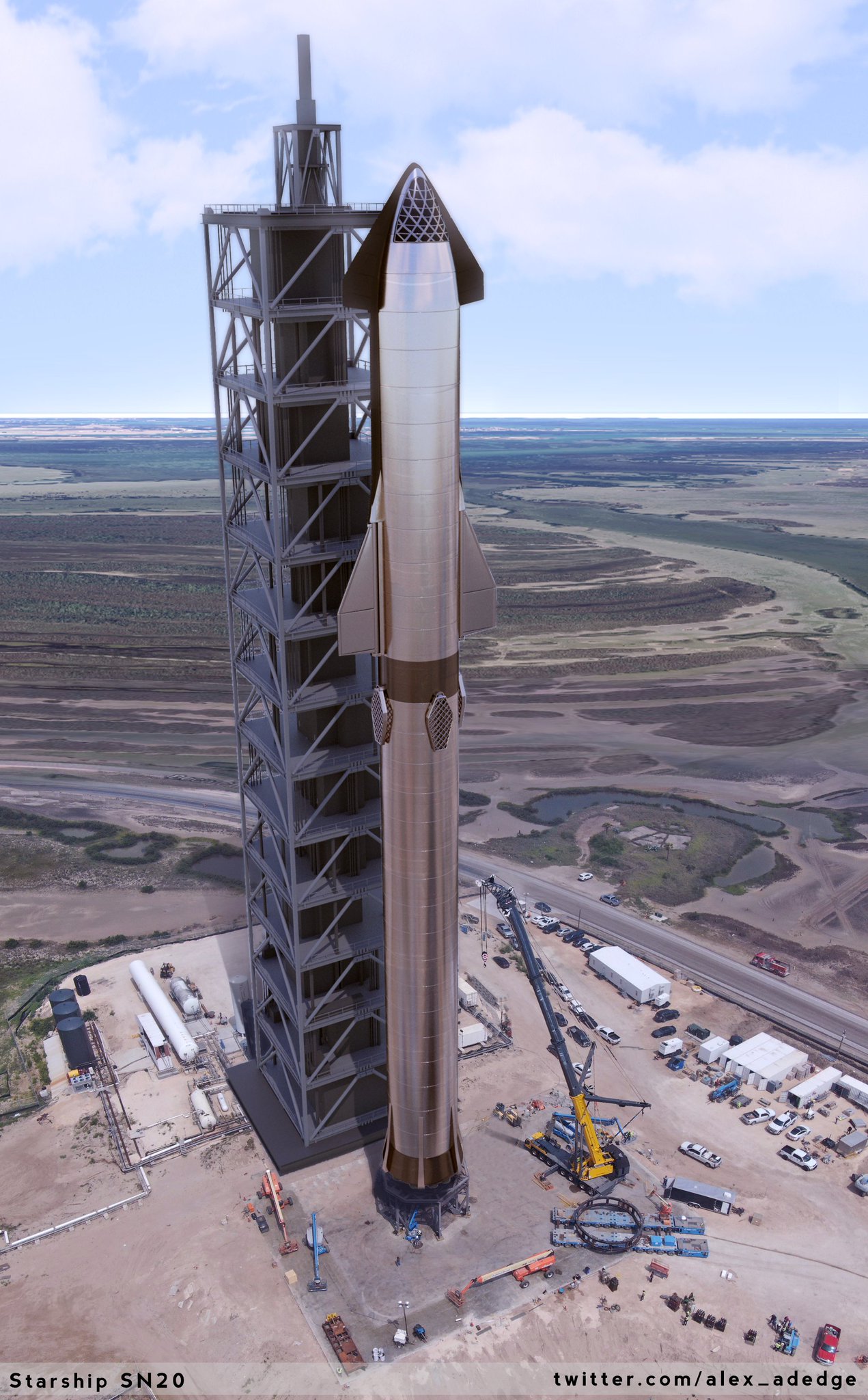 This move is a precursor to the upcoming cryogenic test that will be performed on this Starship prototype aka Ship 20 Starship 20 and S20 as well give us a break SpaceX community. The picture appears to show the Starship SN20 Serial No. After that the booster would turn around for descent and land in the Gulf of Mexico off the coast from Boca Chica while the upper stage would go into orbit for a little while before splashing down in the Pacific.