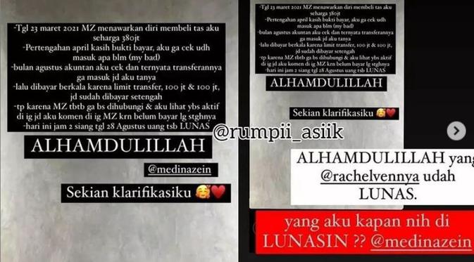 Alhamdulillah yang rachelvennya udah lunas. Ia pun menagih uang yang kemudian menyinggung soal dana haji dan umroh. Seperti diketahui sosok yang akrab disapa Ciki ini sempat menagih utang pada Medina Zein lewat Instagram Story.